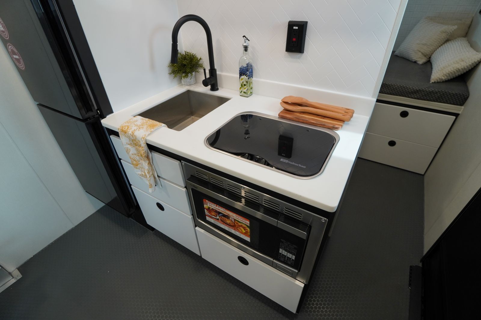 Gourmet Kitchenette: Includes a 6.2 Cu Ft Refrigerator (12V), a Convection Microwave, and an LP Cooktop (2 Burner).